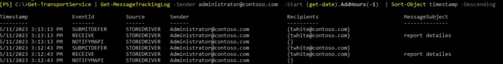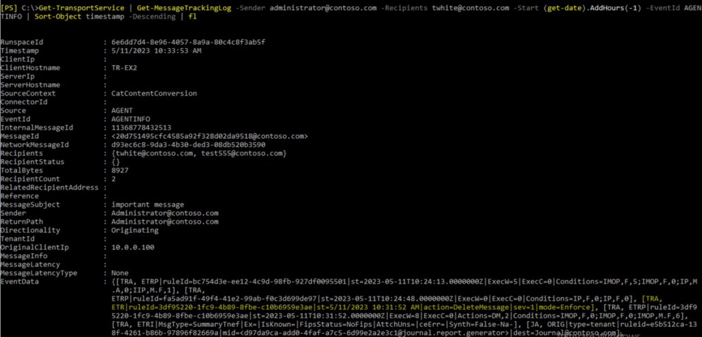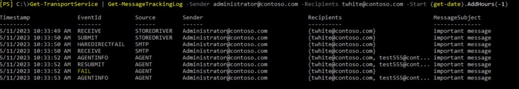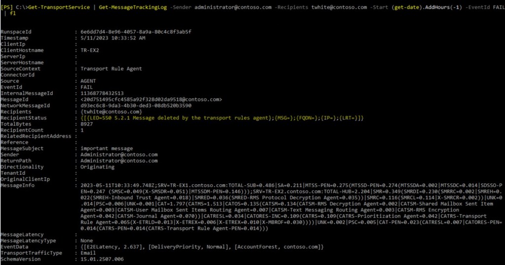- We have example of message that wasn’t delivered. For example, who, whom, when, subject and so on. You can search message tracking logs with appropriate filter.