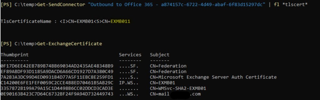 2. Let’s check appropriate property of send connector and certificates we have on problematic server: