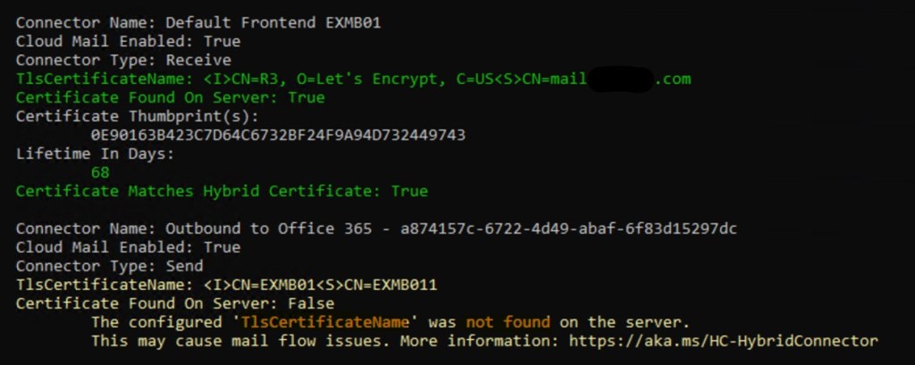 TLSDomainCapabilities and TLSCertificateName are configured by HCW. Certificate, defined in TLSCertificateName should be available on all servers, participating in mail flow between O365 and on-prem. It should be valid from O365 perspective – trusted, label that matches the external FQDN of your Edge Transport or Mailbox servers, such as edge.contoso.com. For more information on certificate requirements visit Certificate requirements for hybrid deployments | Microsoft Learn