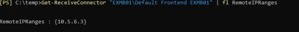 We can the same errors about service availability. Some connections are coming from EOP IP addresses (104.47.*) and others from server itself (Managed Availability healthchecks). Usually, message “service is unavailable” appears if no appropriate connector exist for incoming connections. Let’s check RemoteIPProperty for our connector: