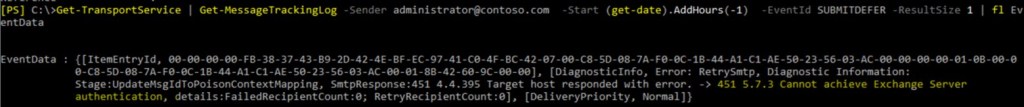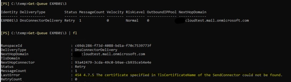 - In this scenario we figured out that Mailbox servers configured to send emails directly to cloud servers. This is exact error message we see for specific queue: