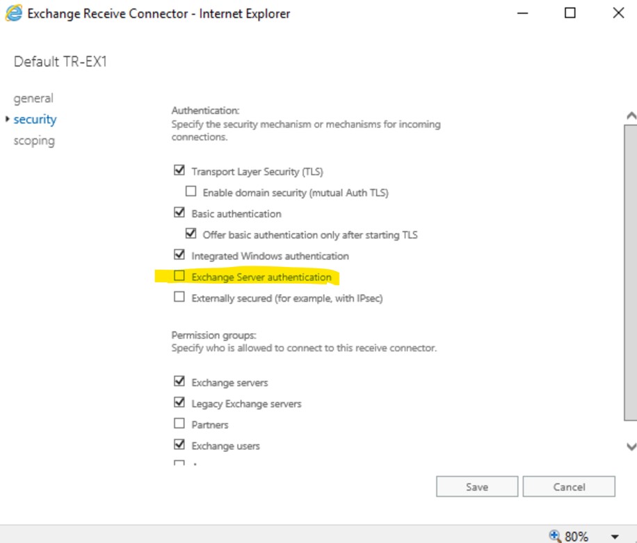 PermissionGroups : AnonymousUsers, ExchangeServers, ExchangeLegacyServers