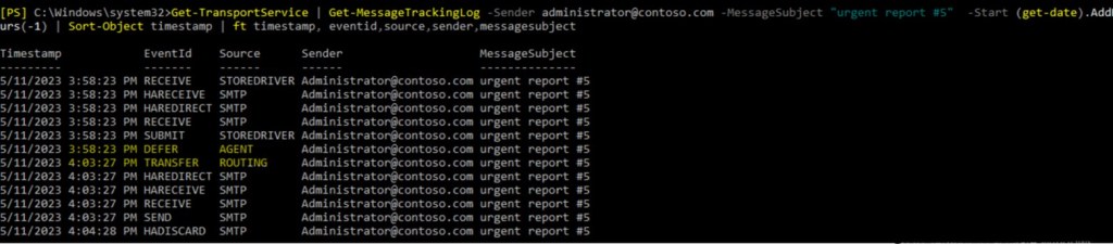 - Search for problematic email in message tracking logs: