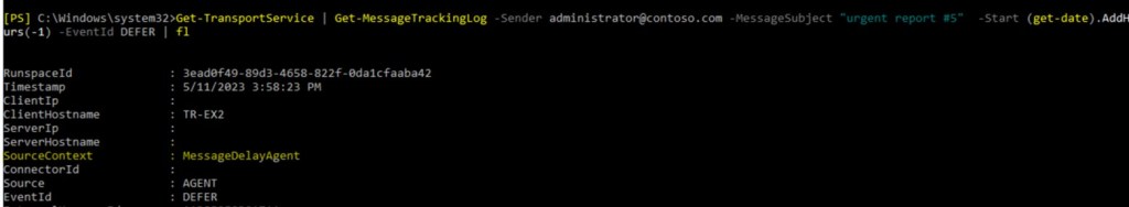 - We have example of message that experienced delays. For example, who, whom, when, subject and so on. You can search message tracking logs with appropriate filter.