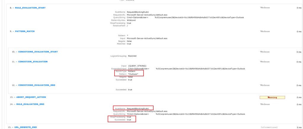 On request details tab we can see exact information on IIS rewrite module and blocking rule: